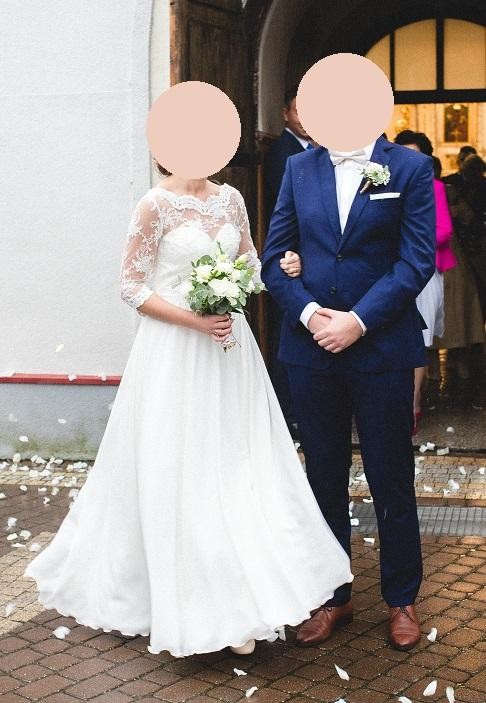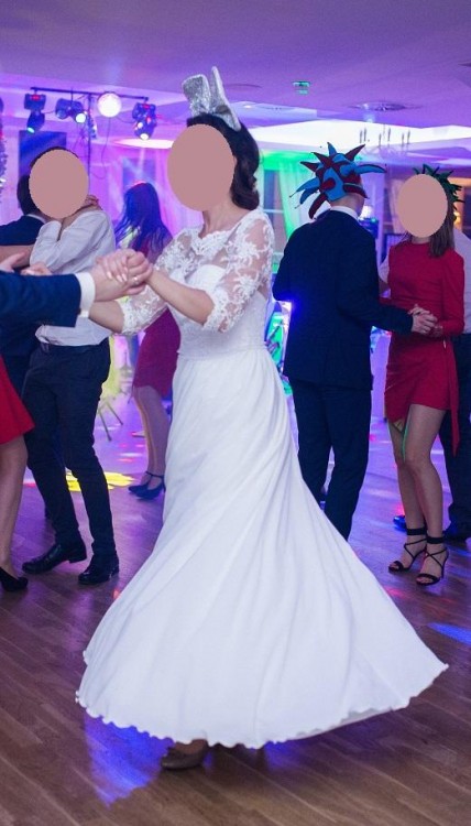 mam do sprzedania przepiękną sukienkę ślubną z rękawkiem 3/4 szytą na wymiar przez krawcową. Sukienka w kolorze ivory, bardzo wygodna.