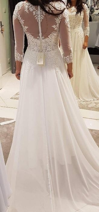 Suknia posiada delikatny podpinany na jeden guzik tren.