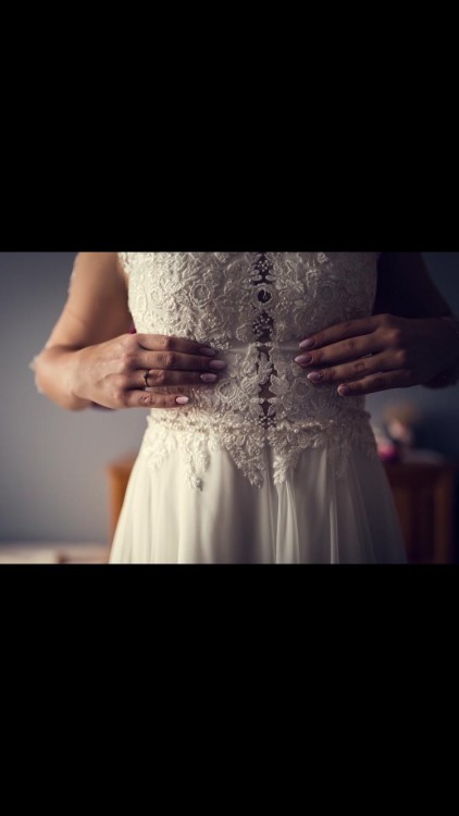 Suknia szyta na wzrost 164 cm + obcas 9 cm, rozmiar M. Góra sukni wykonana z pięknej koronki, z tyłu wycięcie w kształcie litery V, zapinana na zamek i guziczki co sprawia że suknia idealnie się trzyma. Rękawy 3/4 zakończone koronką i guziczkami (możliwość odcięcia rękawów). Dół sukni wykonany z muślinu z rozcięciem.
