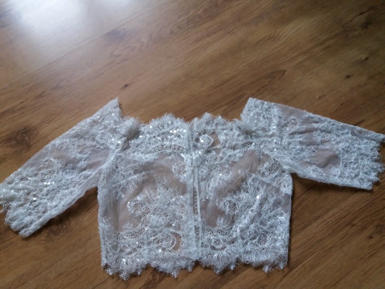 Do sukni dołączam koronkowe bolerko z rękawem do łokcia, zapinane z tyłu na guziczki - idealnie pasuje do całości.