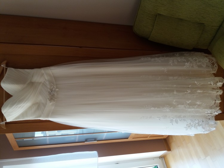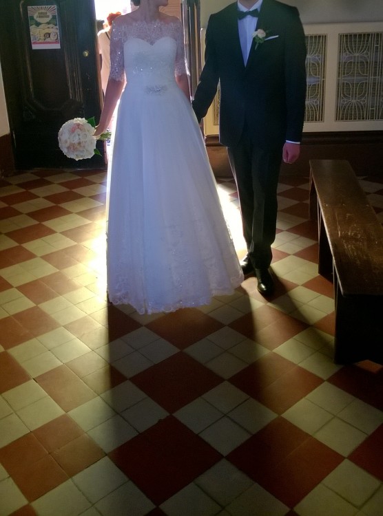 Suknia ślubna została dopasowana do mojej sylwetki, będzie pasowała na Panie noszące rozmiar 38 istnieje możliwość powiększenia lub zmniejszenia sukni o 1 rozmiar.