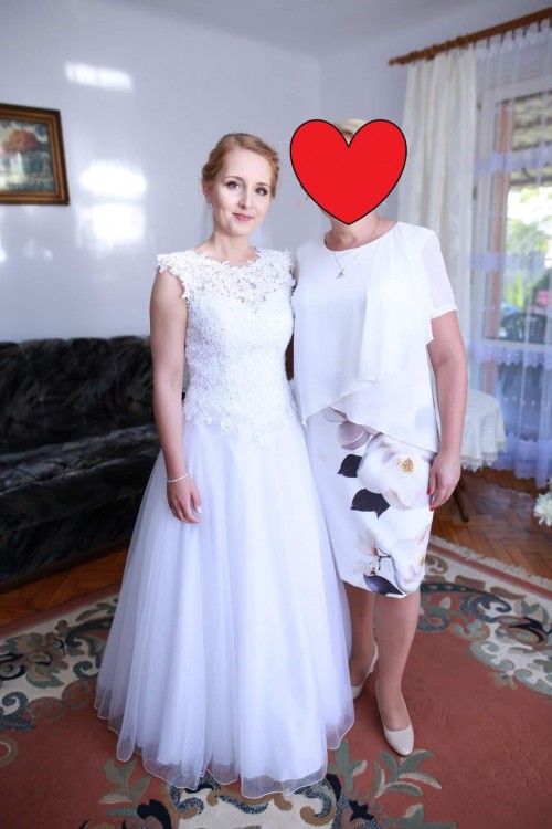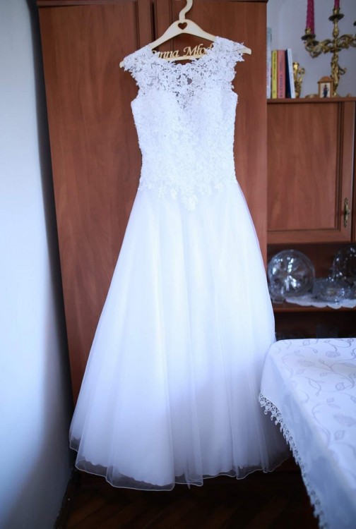 Suknia jest biała, z wcięciem na plecach. Zawiązywana na gorset, więc regulacja pozwala dostosować suknię do mniejszej i większej sylwetki.