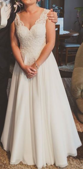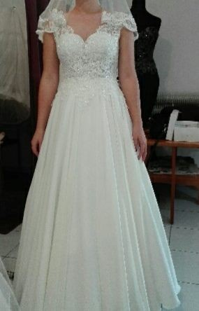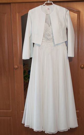 Mam do sprzedania suknię ślubną w rozmiarze XS. Suknia jest w bardzo dobrym stanie. Góra sukni wykonana jest z koronki, dół muślinowy, do tego halka na kole, marynarka z długim rękawem oraz welon wykończony koronką( taka sama koronka jak góra sukni. Suknia na wzrost 155 cm + 8 cm obcas.