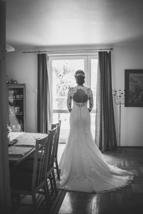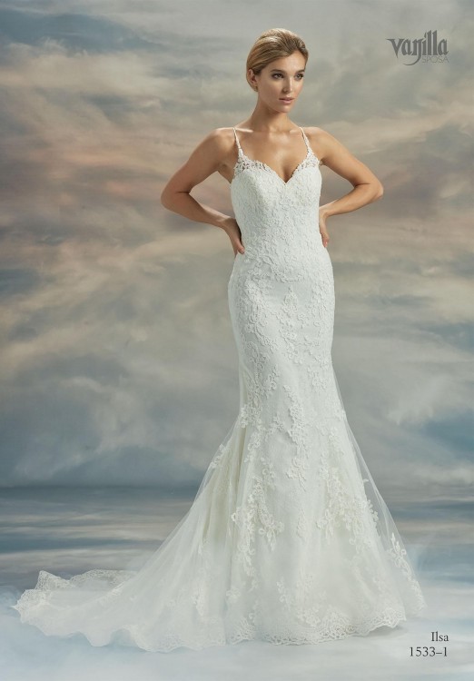 Suknia ślubna na ramiączkach, odkryte plecy, seksowny dekold. Składa się z dwóch warstw, na zewnętrzną warstwę ręcznie naszywana, gruba koronka. Posiada tren widoczny na zdjęciach. W dół sukni wszyto dodatkowe sztywniki, dzięki czemu pięknie układa się w literę A po podpięciu, bez konieczności użycia koła. Do sukni dobrano rękawki, na które naszyto taką samą koronkę, co na sukience.