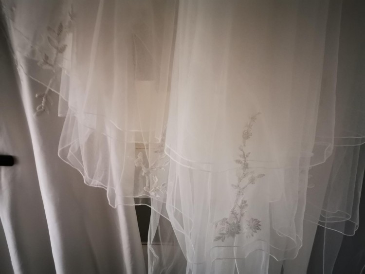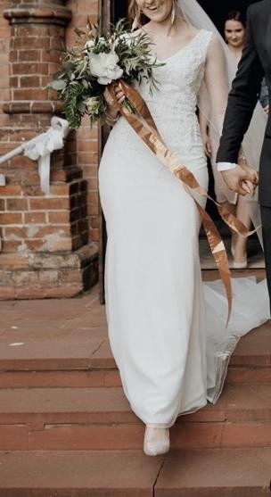 Projektowana na zamówienie suknia ślubna typy rybka z bardzo miękkiego, elastycznego i wygodnego materiału. Suknia posiada odpinany tren. Nie ma więc problemu z podpinaniem. Sukienka z długim rękawem z delikatnym motywem włoskiej koronki, który powtarza się na dekoldzie.
