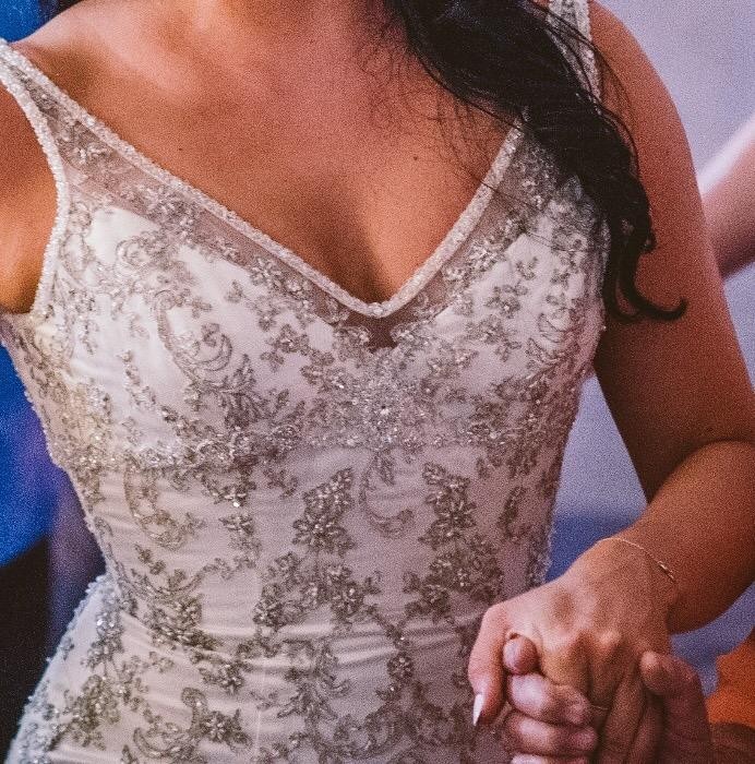 Dopasowana suknia ślubna typu syrena/rybka w kolorze ivory. Na całej długości zdobiona szytymi ręcznie zdobieniami i kamieniami w kolorze srebra. Suknia posiada efektowny, długi tren, który można podpiąć, aby nie przeszkadzał w trakcie tańca. Dekolt w kształcie litery V (wszyte miseczki). Suknia pięknie prezentuje się od tyłu - odsłonięte plecy dzięki dekoltowi w kształcie litery V + długi zdobiony tren dają niesamowity efekt. Suknia posiada wiązany z tyłu gorset, który pozwala na idealne dopasowanie materiału do sylwetki. Dzięki temu nie ma potrzeby znacznych przeróbek. Jedyne możliwe przeróbki to ewentualne dopasowanie w biodrach. Dodatkowo do sukni dołączam gratis 4 metrowy welon w kolorze ivory wykończony koronką i zdobieniami podobnymi jakie występują na sukni.
