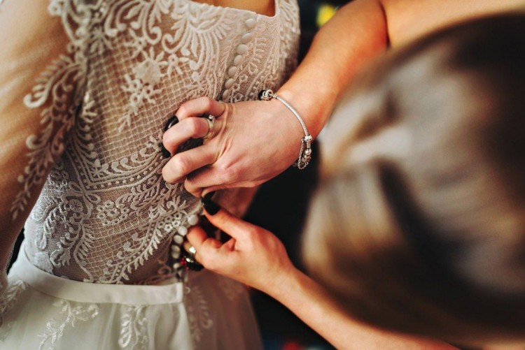 Suknia składa się z dwóch elementów: krótkiej koronkowej sukienki z długim rękawkiem, do której doczepiana jest na zatrzaski długa spódnica ( organza plus kilka warstw cienkiego tiulu).