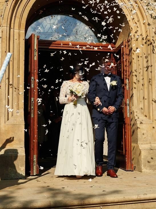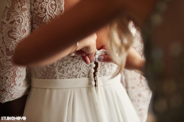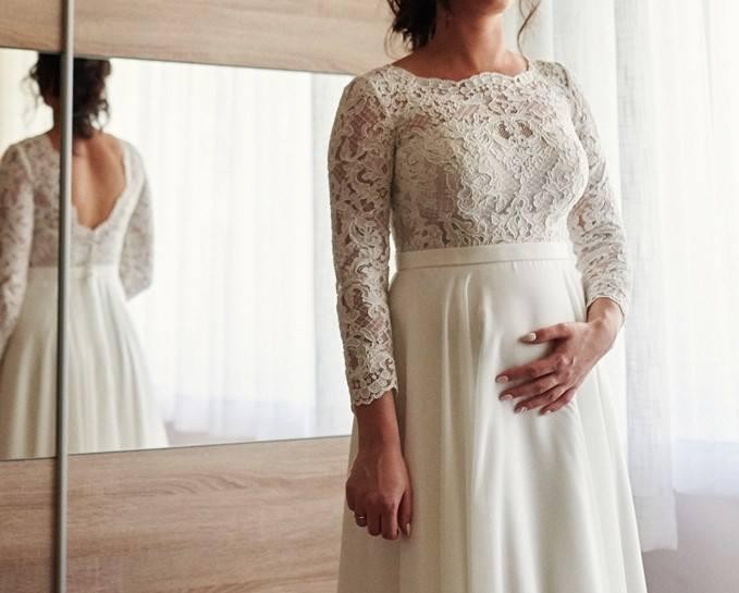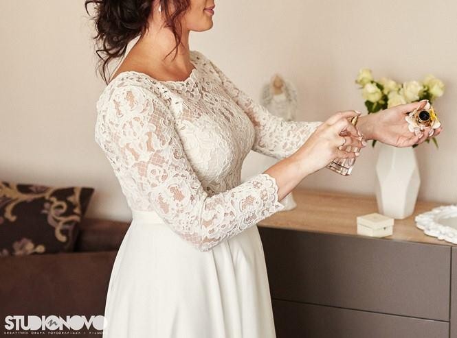 Sukienka szyta na zamówienia w salonie sukien ślubnych Sabe w Wieliczce. Suknia to połączenie dwóch modeli: Melbe + tył Puffy, rękaw o długości 7/8. Lekka, zwiewna w kolorze śmietanki. Pięknie się układa, jest bardzo wygodna, ze względu na materiały z jakich jest ona wykonana.