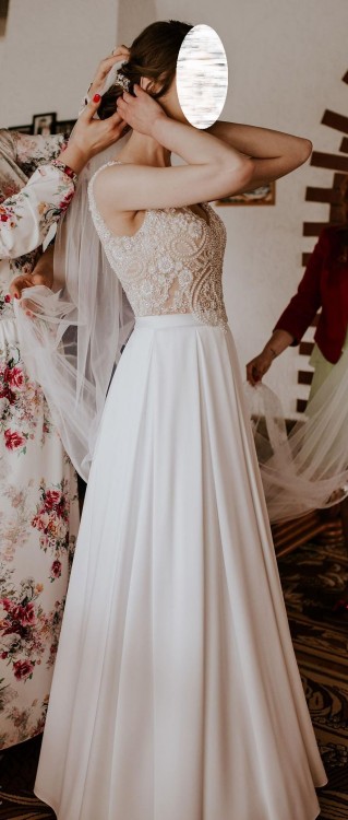 Spódnica sukni wykonana jest z matowej satyny z zakładkami (+ niewielkie koło na osobnej halce - nie musimy go zakładać, wtedy suknia będzie lejąca).