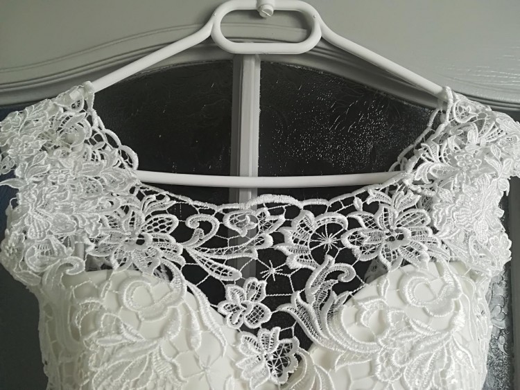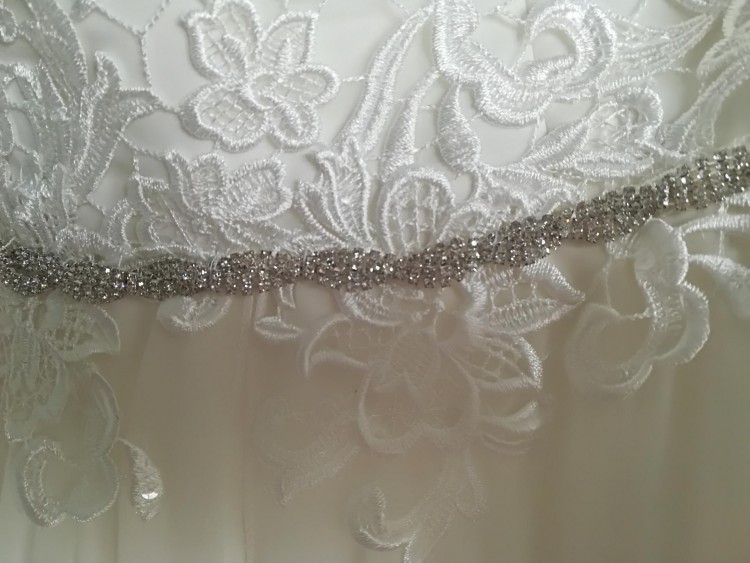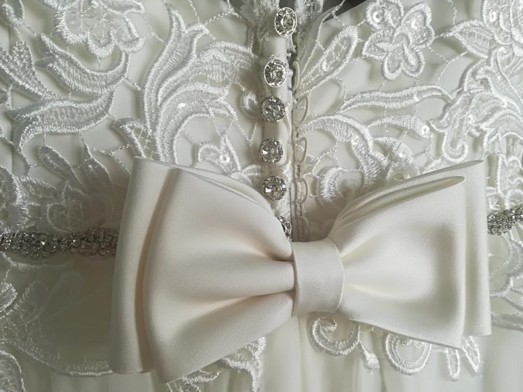 Góra sukni wykonana z pięknej gipiury obniżonej o 1,5 cm pod szyją. Dekolt w serce o 1 cm głębszy i gorset dłuższy o 1 cm niż w oryginale. Do gorsetu zostały wszyte miseczki C. W talii zmieniono pasek na grubszy z modeli BAEBADOS. Tył w kształcie litery V, bez tasiemki wiązanej na kokardkę tylko zapinany na guziczki biżuteryjne z sukni ETIRDA. Z tyłu dodano urocza kokardkę z sukni RITMO. Dół sukni wykonany z zwiewnego muślinu.