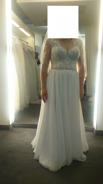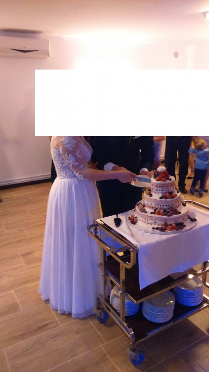 Mam do sprzedania suknie ślubną z kolekcji. Suknia jest wykonana z materiałów najwyższej jakości . Suknia ma z tyłu guziki i jest zapinana na suwak. Ma na górze ozdobną koronkę i piękny lejący materiał u dołu.