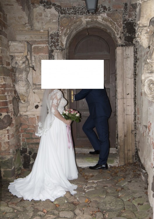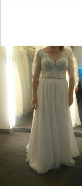 Mam do sprzedania suknie ślubną z kolekcji. Suknia jest wykonana z materiałów najwyższej jakości . Suknia ma z tyłu guziki i jest zapinana na suwak. Ma na górze ozdobną koronkę i piękny lejący materiał u dołu.