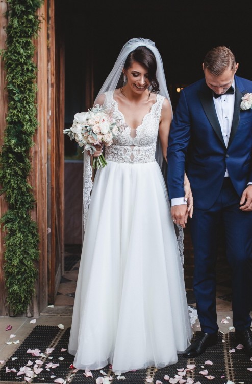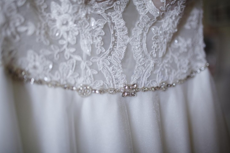 Suknia jest bardzo lekka i wygodna, przód i tył koronka oraz pasek biżuteryjny. Model własny.