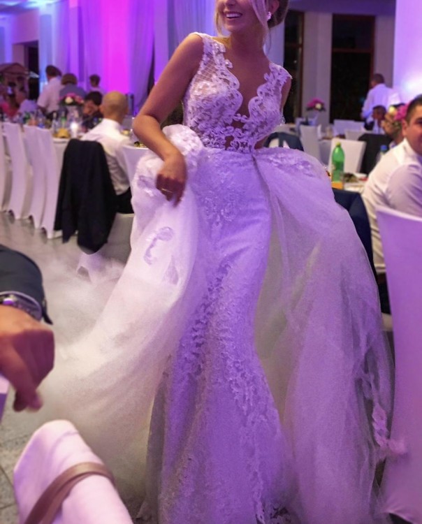 Suknia składa się z 3 części; obcisłej sukienki + dwóch dopinanych trenów.