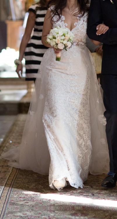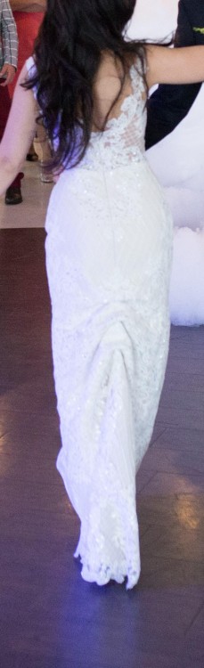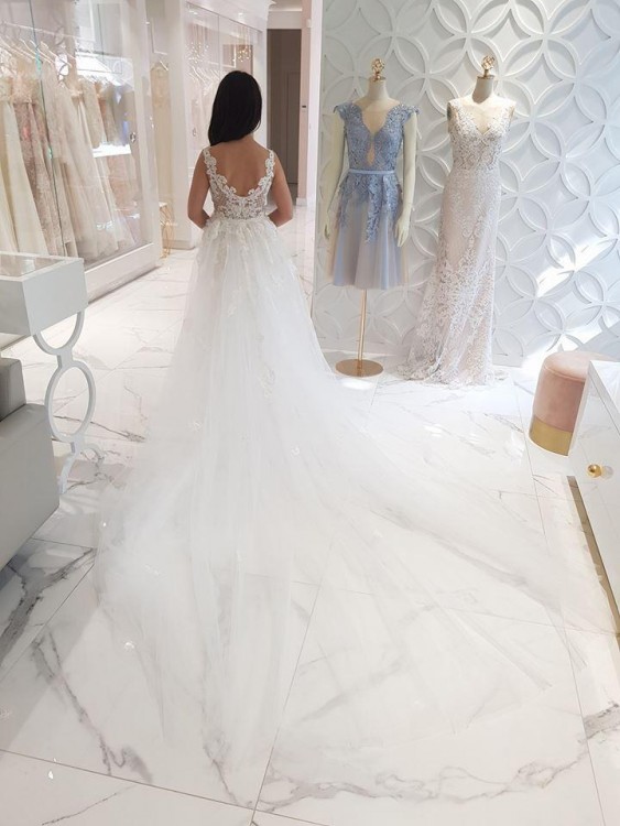 Suknia posiada mini tren, który można podwiązać oraz długi, doczepiany na niewidoczne guziczki.