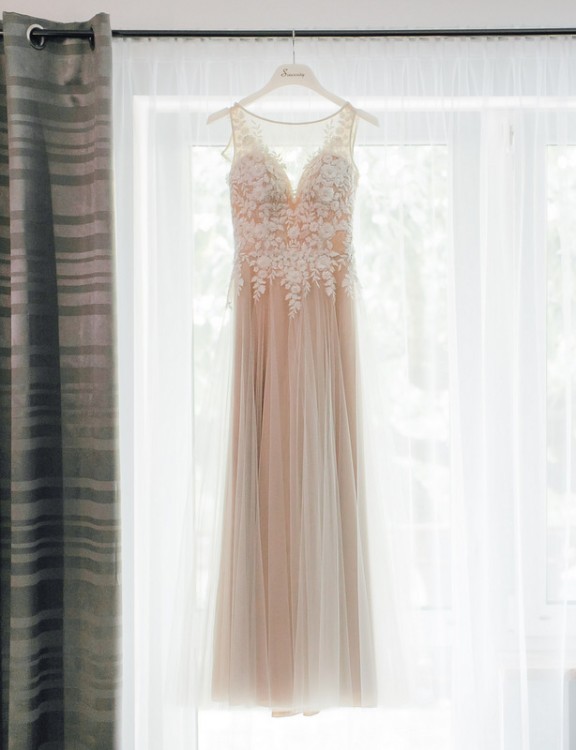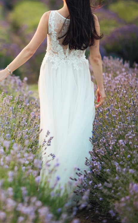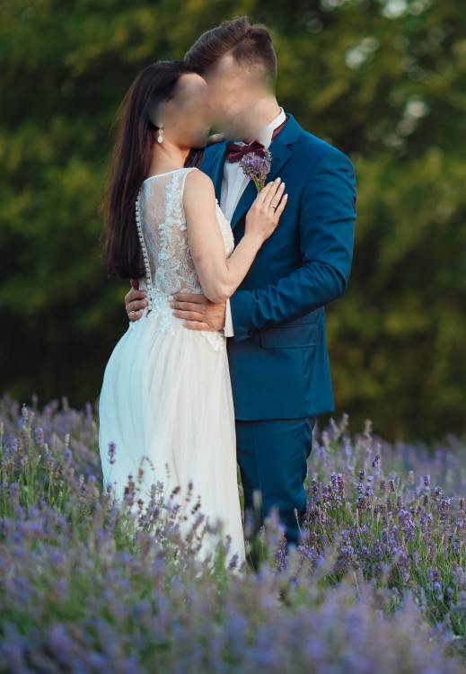 Oryginalnie model sukni ma wycięte plecy, moja ma zabudowane do samej góry – plecy całe z koronki, tył zapinany na rząd kilkunastu pięknych guziczków (wg uznania plecy można wyciąć tak jak w oryginale).
