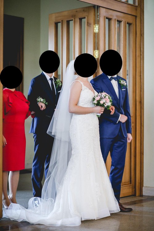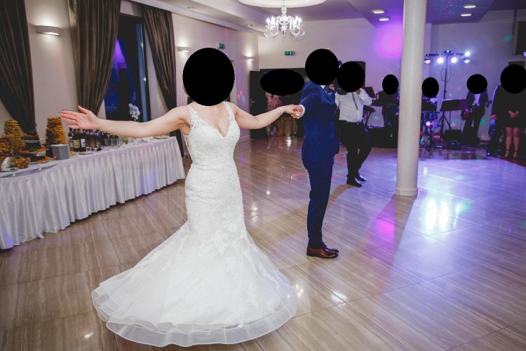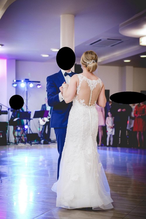 Suknia szyta była na rozmiar 12, ale przy przymiarkach była zmniejszana - ja noszę rozmiar 38, wzrost 170 plus 9 cm obcas. Jest to fason rybki, ale nie bardzo obcisła. Obszyta jest koronką, koralikami i małymi perełkami. Plecy pokryte cielistą siateczką i ozdobione koronką. W miejscu obszytym koronką w okolicy pach są paski sylikonowe, żeby nic nie drażniło w skórę. Suknia ma wszyte miseczki, więc nie trzeba zakładać pod nią biustonosza. Można je spokojnie wyjąć.
