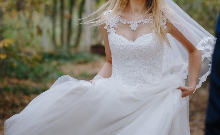 Piękna suknia ślubna z trenem w kolorze ivory.