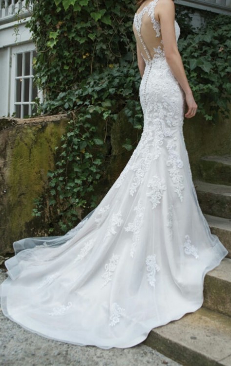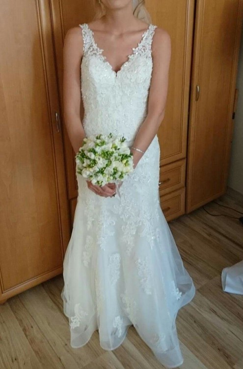 Suknia zakupiona została w sierpniu tego roku, jest w kolorze ivory (śmietankowy), w kształcie syreny, suknia jest wyszywana koralikami i cekinami, na dole sukni wyszywane są hafty. Długi tren jest podpinany, wszyte miski biustonosza. Szyta na wzrost 175cm (sam dół gładki- możliwość skrócenia sukni). Rozmiar to 36/38.