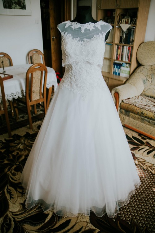 Zmiany które dokonałam w sukni na własna rękę u krawcowej łącznie z praniem to wymiana dołu - suknia nie posiada haftów, które są standardowo w tym modelu, ma lepiej wykonaną halkę i grubszy tiul od spodu dzięki czemu lepiej się układa, górny tiul jest lekki, gładki z obrębionym dołem.