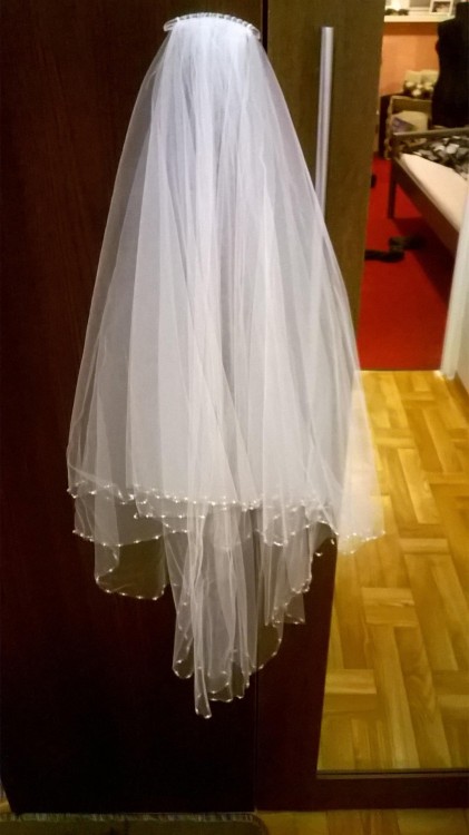 Dodatkowo dołączam welon, uszyty przez krawcową do mojej sukni - prosty, biały z delikatnymi koralikami przy brzegu, dwuwarstwowy na przezroczystym grzebyku.