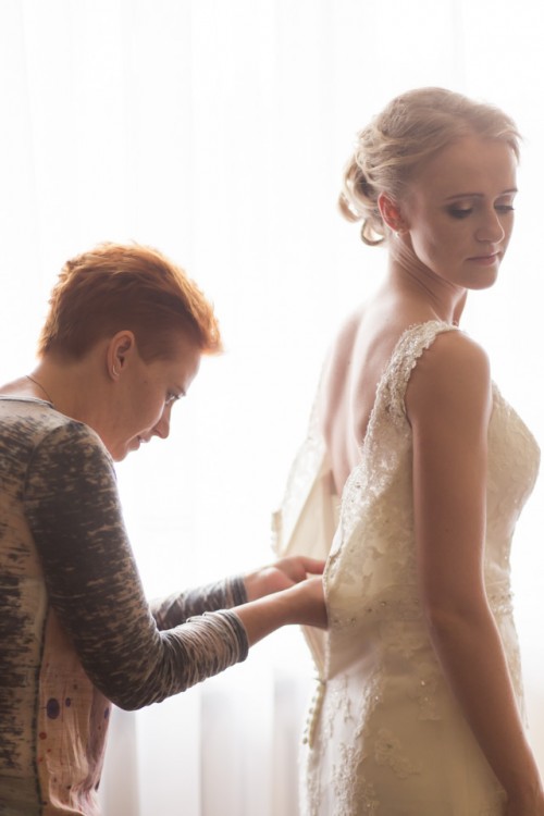 Suknia typu rybka, dekolt w kształcie litery V. Głęboko wycięte plecy, tył zapinany na suwak przykryty guziczkami, w talii paseczek z delikatnym wzorem z kryształków. Suknia uszyta jest z koronki, wyszywana kryształkami.