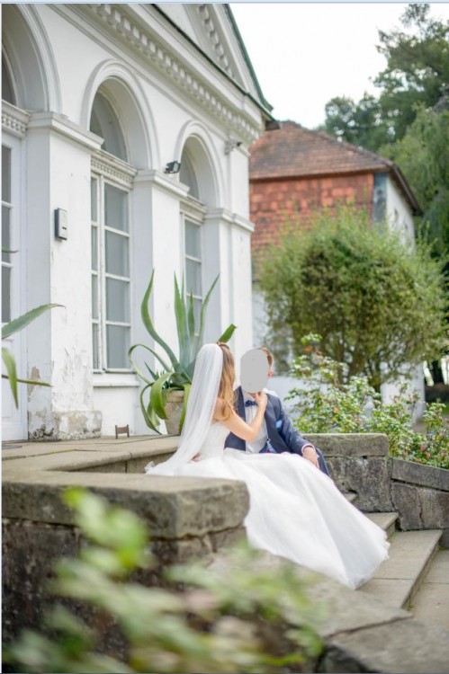 Kolor Ivory. Koronkowa góra.Tiulowy dół. Długi tren + Welon