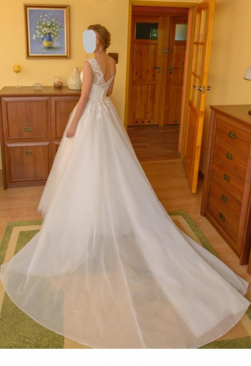 Góra sukni wykonana z koronki, ozdobiona delikatnymi kryształkami, tył sukni wycięty w kształcie litery "V"- zapinany na guziczki, dół tiulowy (nie posiada koła) z pięknym długim trenem - możliwość niewidocznego podpięcia (pod spód). Kolor Ivory.