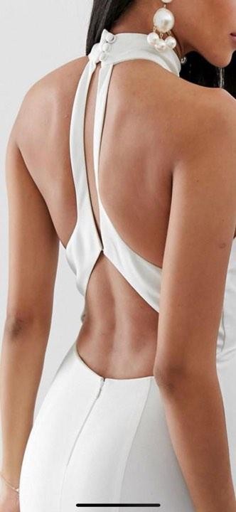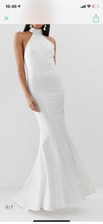 Nowa, biała długa suknia z trenem firmy JARLO TALL. Na stronie Asos za 599 zł.