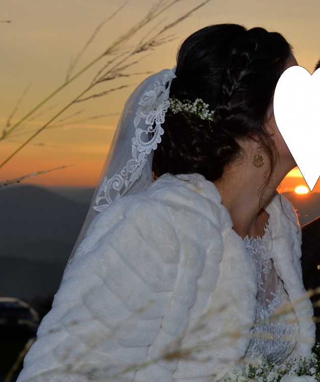 Suknia ślubna śmietankowa w komplecie z futerkiem i welonem