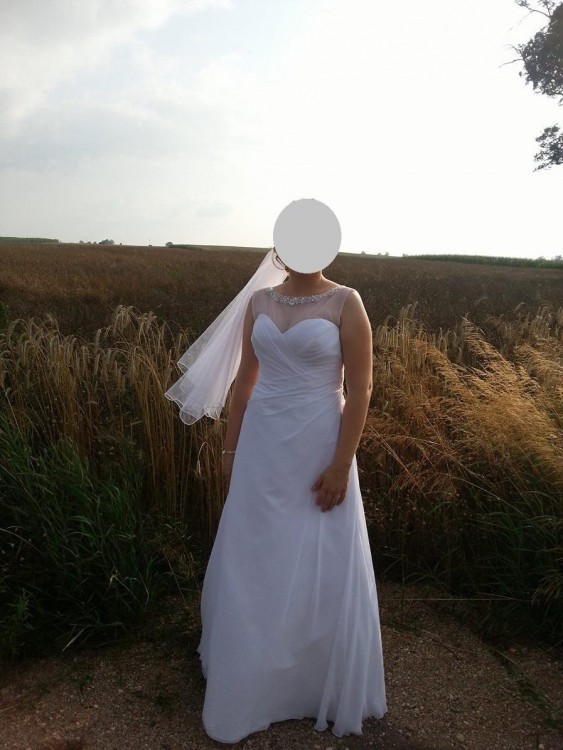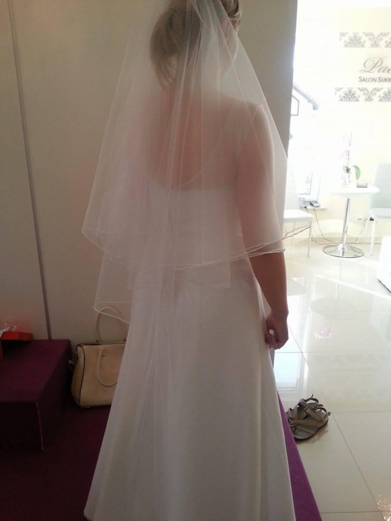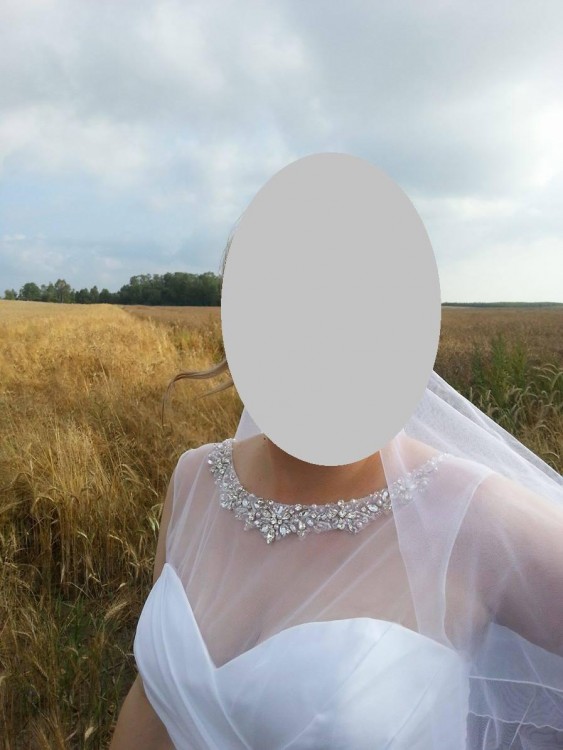 mam na sprzedanie suknię ślubną. Suknia jest skromna, lekka, idealnie układa się w tańcu i co najważniejsze wygodna :) Największym atutem sukni jest skromne, a zarazem bogate zdobienie. Góra sukni posiada delikatną siateczkę zakończoną wyszytą "kolią". Z tyłu siateczka układa się w literę V, dopasowaną do zamka. Suknia szyta była na wzrost 165cm + obcas 5cm. Suknia jest profesjonalnie wyczyszczona, nie posiada plam, żadnych uszczerbków, ani śladu użytkowania.