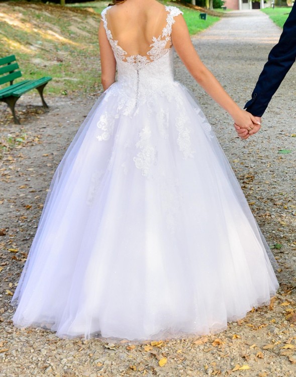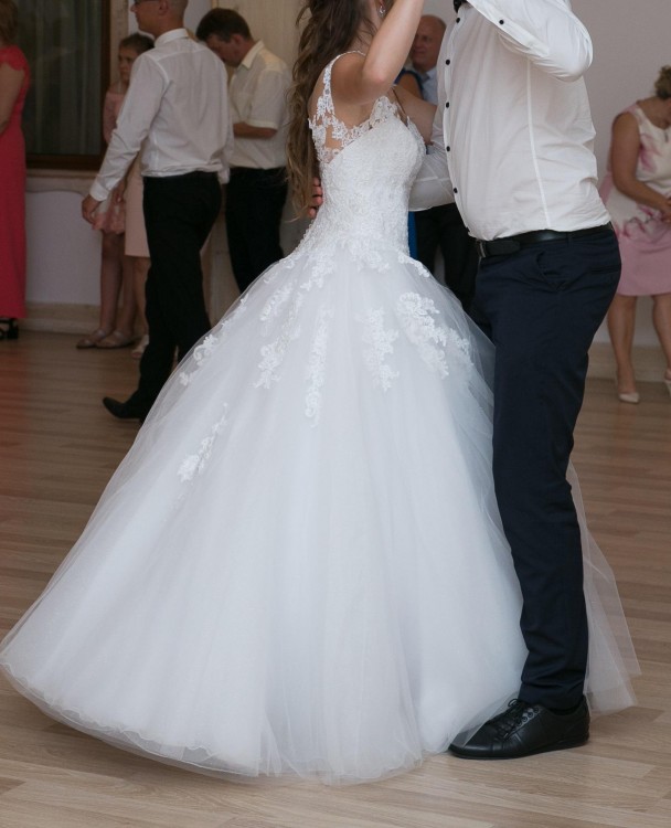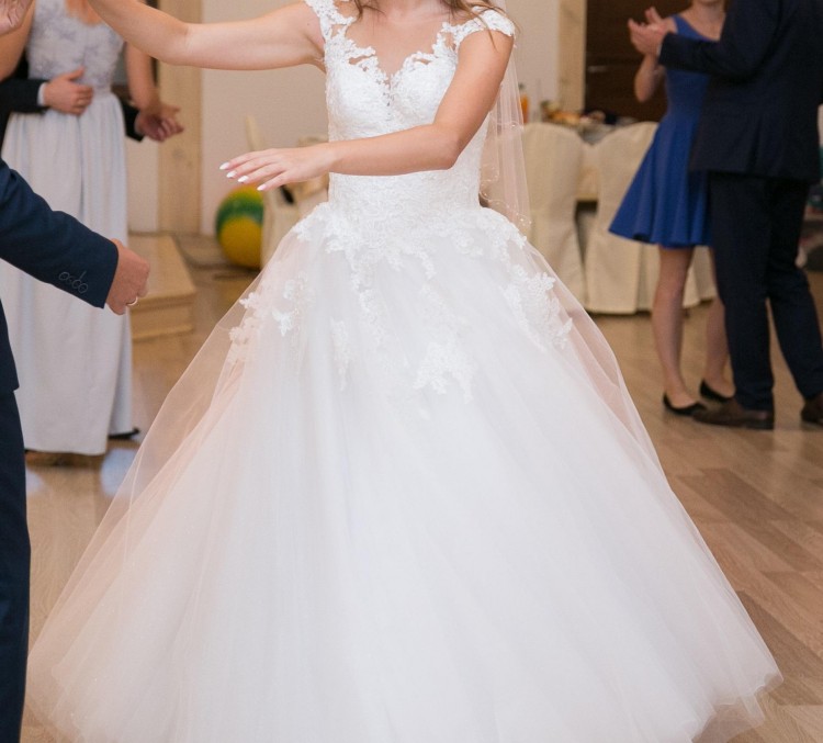 Mam do sprzedania piękną suknię koloru śnieżnobiałego. Zakupiona w Salonie Sukien Ślubnych. Pokryta ozdobną koronką, tiul błyszczący, pięknie eksponuje plecy, podkreśla talię, tył zapinany na guziczki. Suknia nie krępuje ruchów, nie zsuwa się z ramion, posiada cielistą siateczkę , w tańcu pięknie się obraca. Zdjęcia nie oddają jej blasku. Wyprana w pralni, uprasowana, nie posiada defektów. Suknię sprzedaję razem z halką z kołem i pokrowcem.