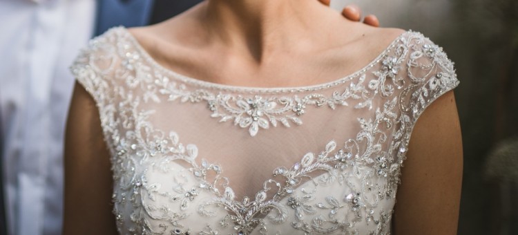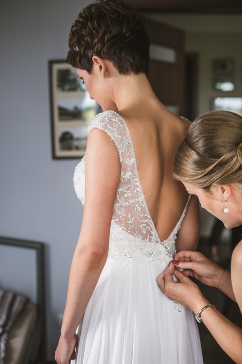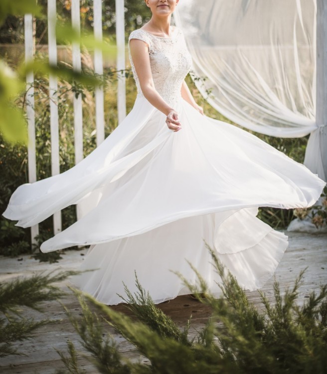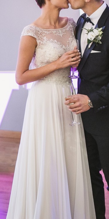 Suknia o fasonie litery A wykonana jest z delikatnego muślinu co nadaje jej lekkości. Od pasa w górę zdobiona kamieniami, pięknie eksponuje plecy.