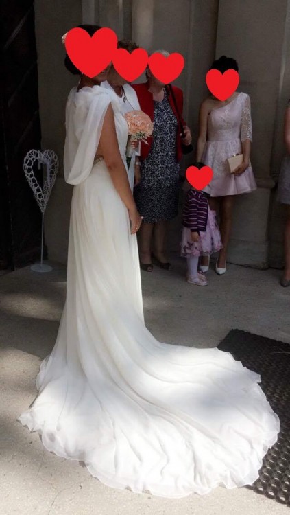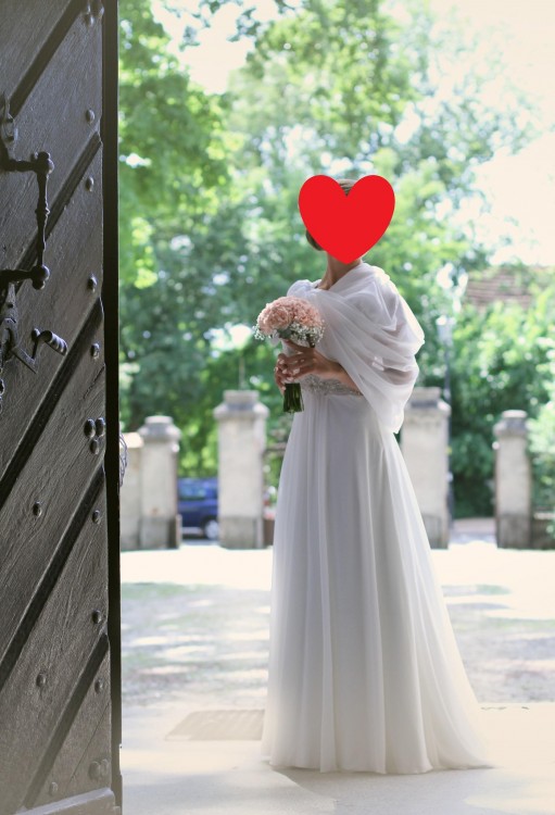 Suknia została zakupiona w salonie La Mariee w Warszawie. Suknia jest w kolorze ivory (złamana biel/śmietankowy). Została uszyta na kobietę o wzroście 160cm + 8cm obcas. Wymiary Panny Młodej dla której była szyta to: 65 talia, 93 biodra, biust 65D. Jednak rozmiar bioder nie ma tutaj większego znaczenia, gdyż suknia jest odcinana w pasie. Natomiast biust został dopełniony poduszeczkami, które dla Panny Młodej o większym biuście krawcowa będzie mogła wypruć. Suknia została ubrana tylko w dzień ślubu, a następnie oddana do czyszczenia. Stan sukni oceniam na bardzo dobry.