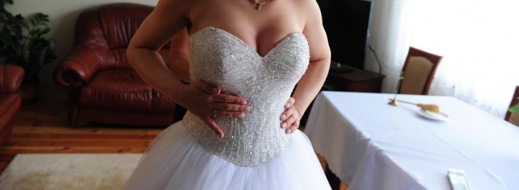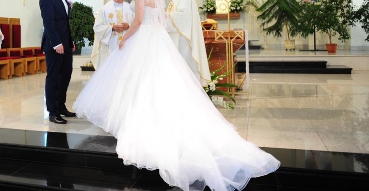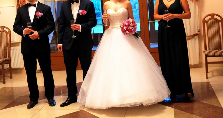 Suknia posiada sznurowany gorset więc można dopasować ją do figury ( nie była przerabiana więc możliwe jest zwężenie lub poszerzenie o 1 rozmiar). Gorset wyszyty kryształkami Swarovskiego, dekolt w serduszko. Z tyłu posiada piękny tiulowy tren, który można podpiąć. Suknia szyta na wzrost 164 cm + ok 12 cm obcasy. Dodatkowo wszyte koło, które można swobodnie wypruć. Suknia zakupiona w salonie La Mariee w Warszawie.