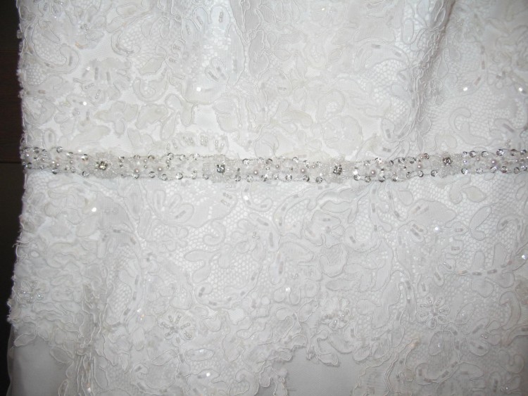 - Suknia posiada piękny, zdobiony kryształkami i perełkami, łańcuszek w talii