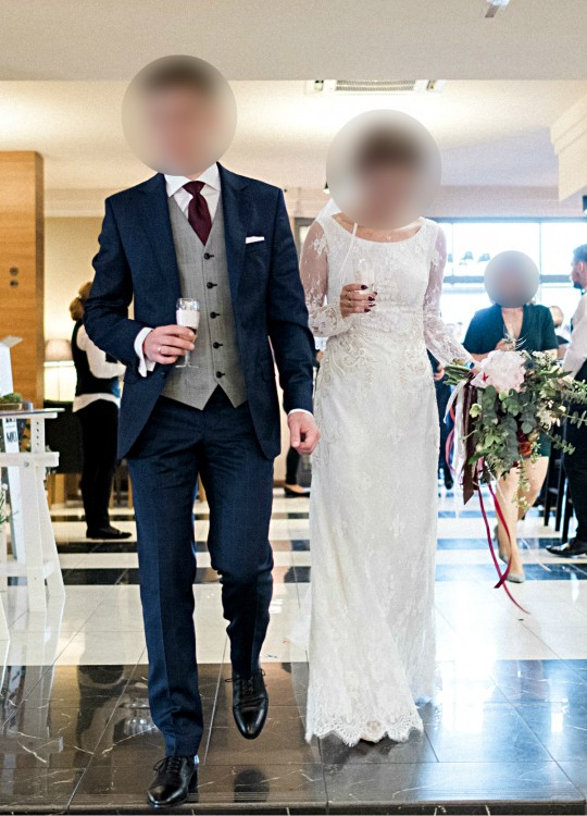 Suknia pochodzi z salonu Sposa, model Mona Lisa z kolekcji na rok 2017. Jest w kolorze ecru. Składa się z dwóch różnych koronek - od spodu płaskiej, z wierzchu wypukłej, co razem tworzy bardzo oryginalny, przestrzenny efekt - oraz podszewki. Rękawy uszyte są wyłącznie z koronki wykorzystanej na zewnątrz, dzięki czemu suknia nie ma wyglądu ciężkiej, masywnej. Po obu stronach talii ma bogatą, trójwymiarową aplikację ozdobioną delikatnymi, srebrnymi koralikami.