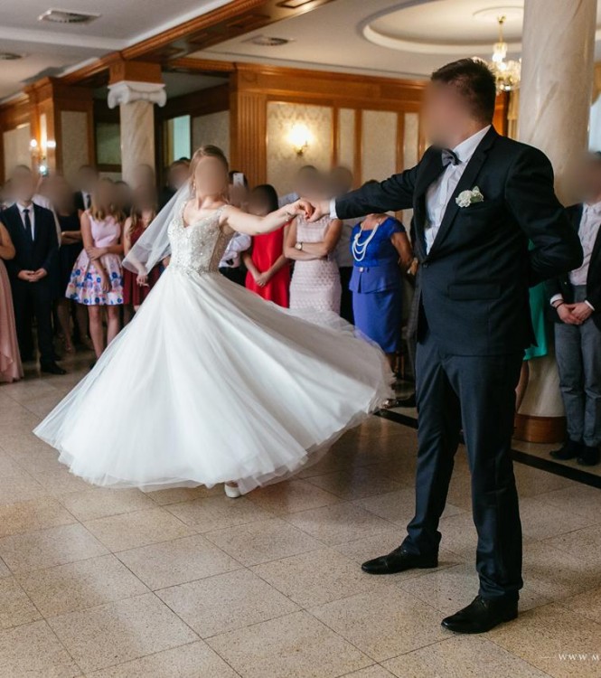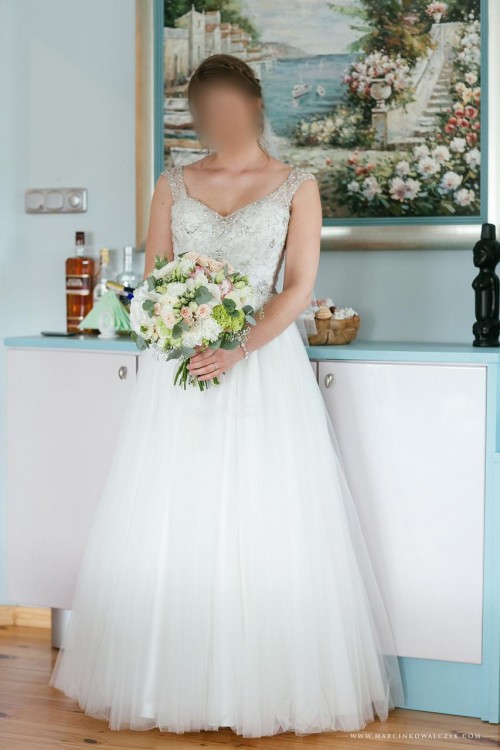 Suknia jest w bardzo dobrym stanie. Sugerowana cena to 3200 zł.
