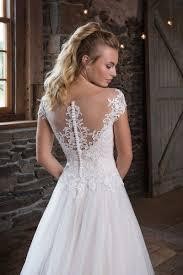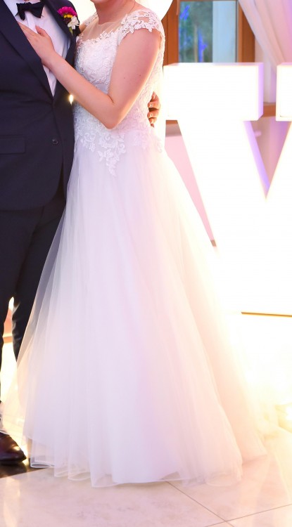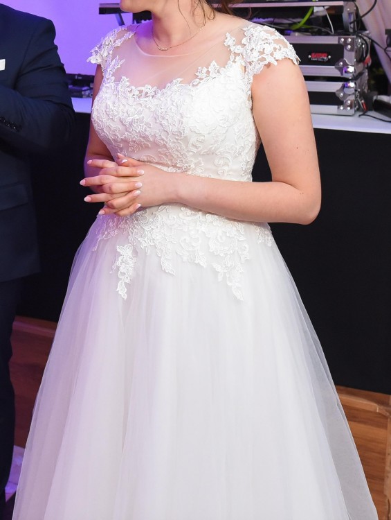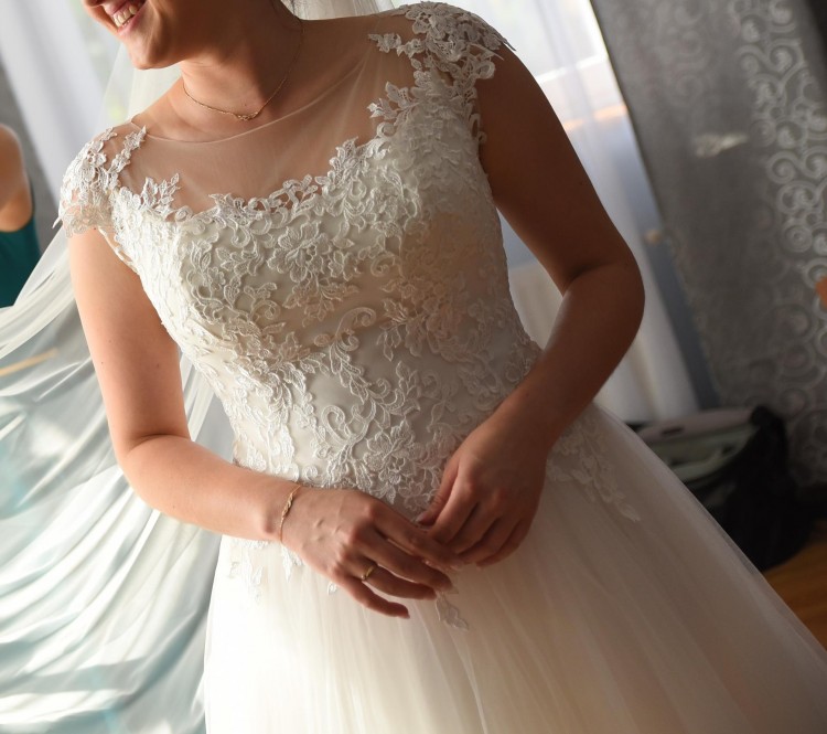 Góra sukni wyszywana koronką, dół z tiulu. Suknia zapinana na zamek i guziczki.