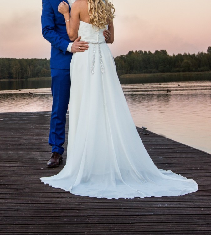Sprzedam suknię ślubną, w kolorze ivory. Rozmiar z metki to 38, może również pasować na 36. Założona 2 razy,na uroczystość oraz sesję plenerową. Po ślubie była oddana do czyszczenia. Suknia ma usztywniony gorset, z wierzchu pokryty plisowanym muślinem. Z tyłu gorset jest zasuwany, dodatkowo pokryty guziczkami. Spódnica ma podwójny materiał, od spodu jest sztywniejszy, na wierzchu muślinowa mgiełka, która z tyłu przechodzi w tren podpinany na guziczek. Dodatkiem jest pasek, który podkreśla talię i pięknie błyszczy. Nie jest na stałe przyszyty do sukienki. Osobnym elementem jest również koronkowe bolerko, które nie jest na sprzedaż.