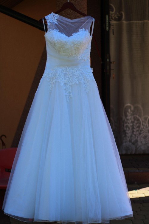 Mam do sprzedania suknię ślubną Sweetheart w kolorze białym, rozmiar 38, szyta na wzrost 160 + wysokość szpilki (jakieś 7 cm). Zakupiona w salonie, założona na ślub i wesele oraz plener. Suknia czysta, wyprana. Wymaga drobnych poprawek krawieckich (wymiana tiulu bądź obcięcie).