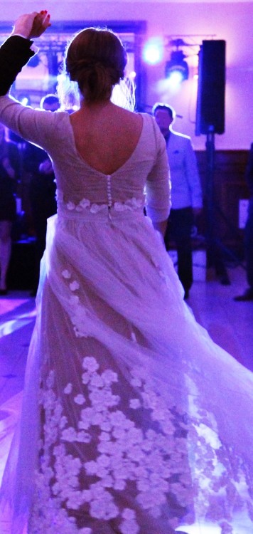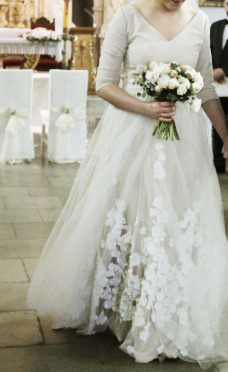 Suknia była szyta na rozmiar 38/40 (głównie ze względu na duży biust) - można ją bardzo prosto zwężyć lub poszerzyć u krawcowej. Góra wykonana jest z gładkiego cielistego materiału, rękaw 3/4 + ręcznie naszywane kwiaty (można je odczepić i wtedy sukienka wygląda tak samo jak na zdjęciu katalogowym). Dół to kilka warstw tiulu najwyższej jakości oraz ręcznie naszywane kwiaty.