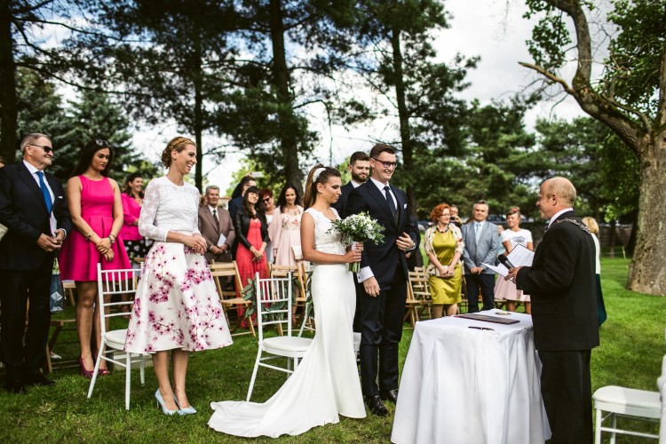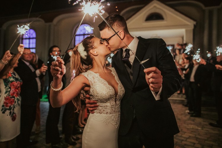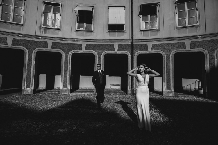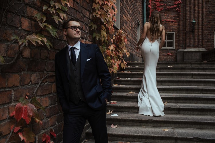 Piękny długi tren (podpinany na guzik) świetnie prezentuje się podczas chodzenia, podkreśla figurę.
