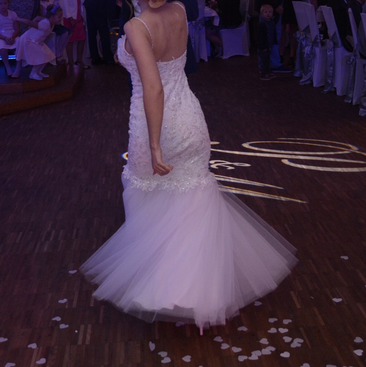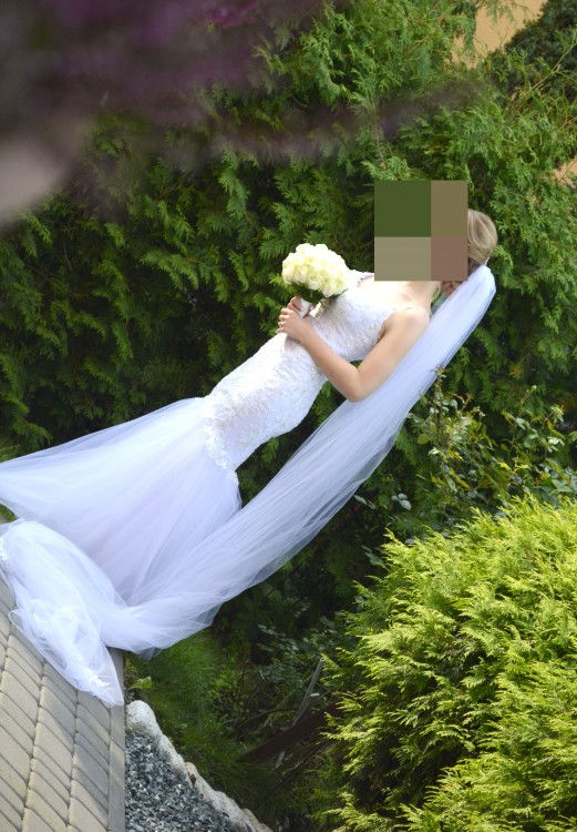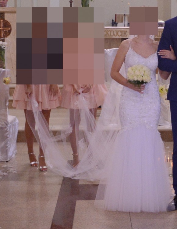 Suknię sprzedaję w komplecie z welonem 2,5m, który na końcu wykończony jest pojedynczymi sztukami haftu (tego samego co na sukience). Welon jest wpinany na grzebyk.