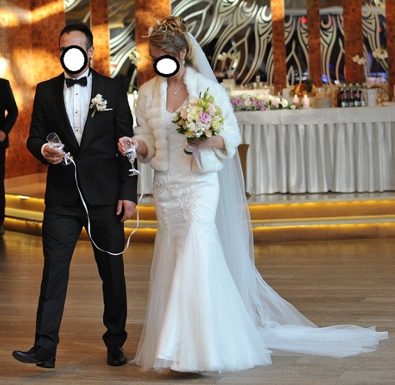 Suknia nie posiada koła przez co jest wygodna i pięknie, naturalnie się układa.
