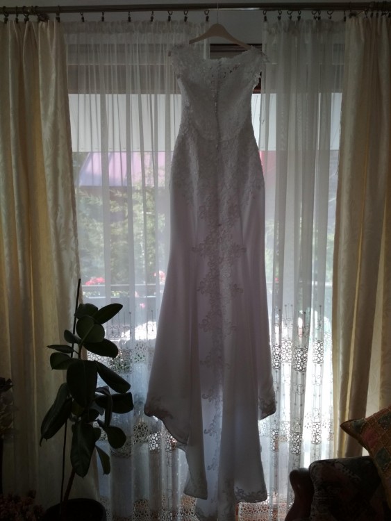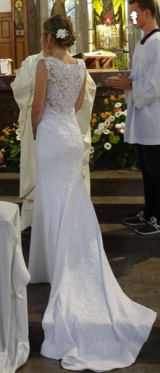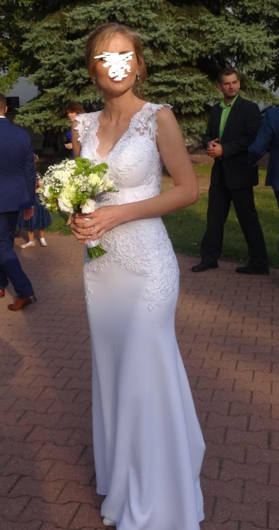 Cześć odsprzedam przepiękną koronkową suknię szytą w salonie w Krakowie, inspiracją była suknia z hiszpańskiej kolekcji Pronovias model Drusilla. Plecy i dekolt są wykonane z koronki, suknia ma przepiękny długi ozdobiony koronką tren z możliwością podpięcia na dwa sposoby (na pętelkę lub pod spód na guziki) Suknia wykonana jest z krepy! Materiał idealny, miękki układa się do ciała, nie krępuje ruchów. Rozmiar 36/38 miseczka C wzrost 170cm plus 7cm obcas. Kształt syrenki ładnie podkreśla sylwetkę. Możliwość przymiarki w Lublinie, cena do negocjacji serdecznie zapraszam:)