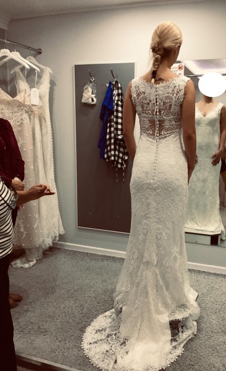 krój : syrenka z trenem podpinanym do góry ( tren tylko z koronki jest lekki i po podpięciu nie ciągnie sukni w dół )