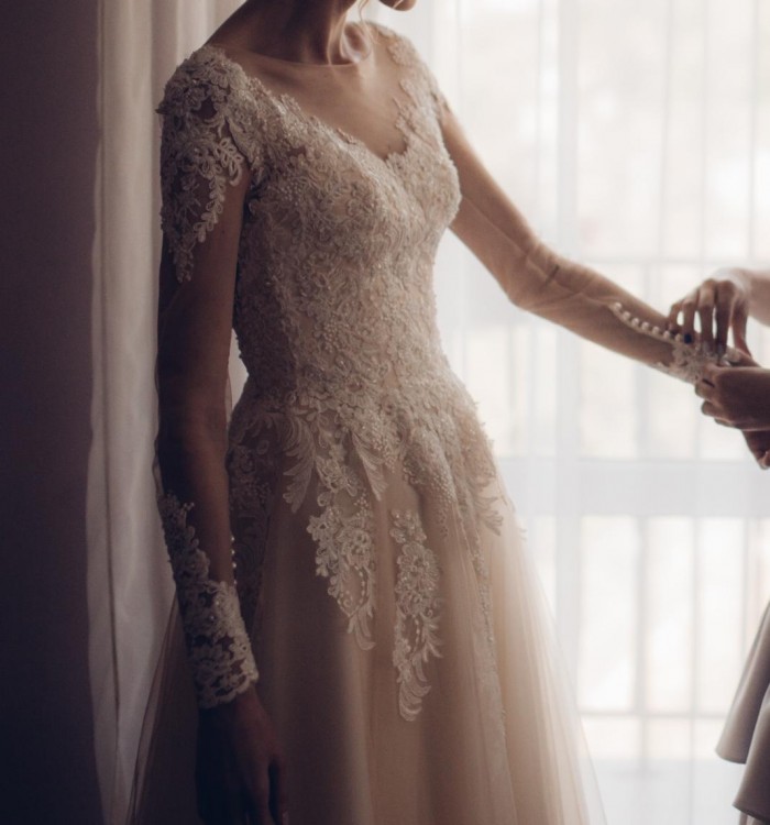Dół sukni jest w kolorze szampańskim (podszewka w kolorze śmietankowym/ivory, 3 warstw tiulu w kolorze śmietankowym i wierzchnia warstwa w kolorze miodowym), koronka w kolorze śmietanki naszyta na przeźroczystą siateczkę.