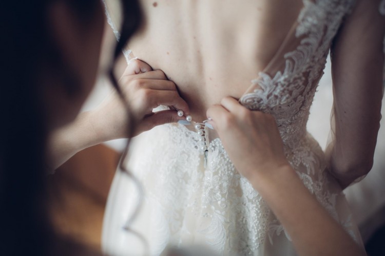 Dekolt na plecach w kształcie litery V, zapinana na guziczki.