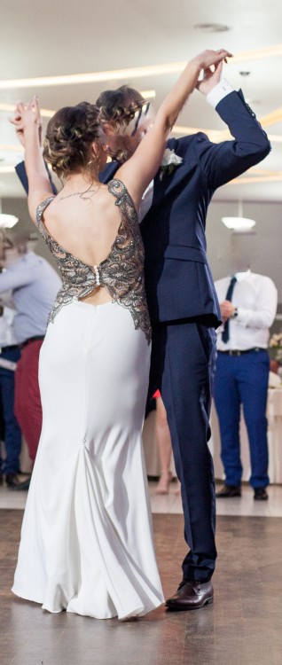 Suknia jest bardzo wygodna, świetnie się układa w tańcu. Z tyłu ma podpinany tren.